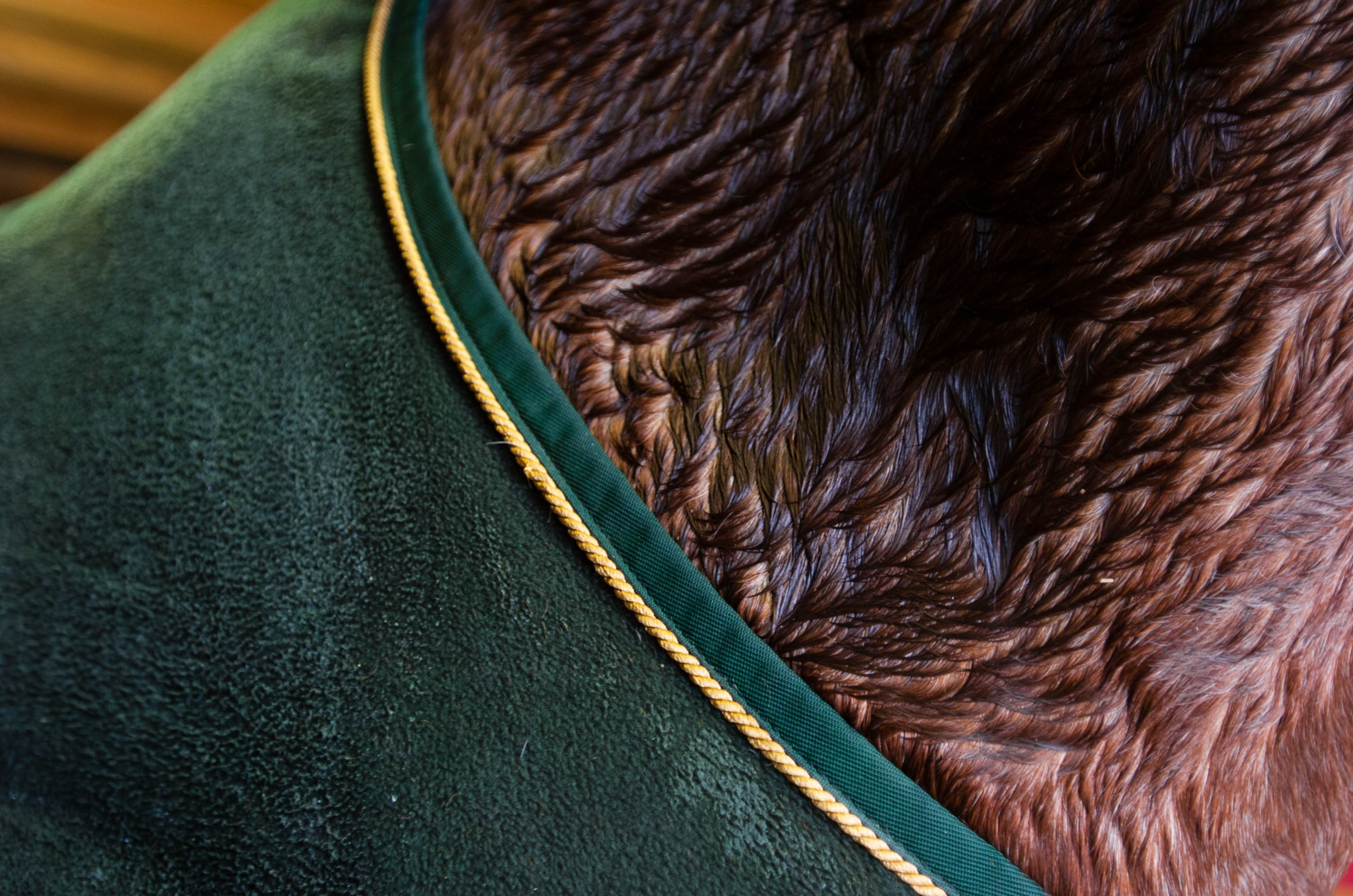 After a winter day’s ride, your unclipped horse may be damp with sweat even after he has cooled out–that is, his body temperature has returned to normal. The key to helping him dry is to enhance, rather than interfere with, the coat’s natural wicking process I described above without making him so warm that he begins to sweat again. It’s very common for riders to pile too many blankets on their horses after a workout, thinking that their mounts are cooling off as quickly as they are themselves. But equine body temperatures don’t drop as quickly as humans’ do. A horse’s just-worked muscles can easily heat up again to the point where he “re-sweats” if you cover him with blankets, particularly if he is unfit or his workout was harder than usual.