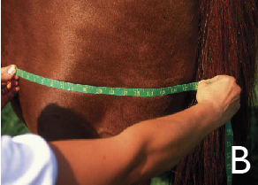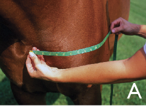 2. Using a cloth tape measure, hold the end of the tape in the center of your horse’s chest, even with the widest part of his shoulder (see Photo A).