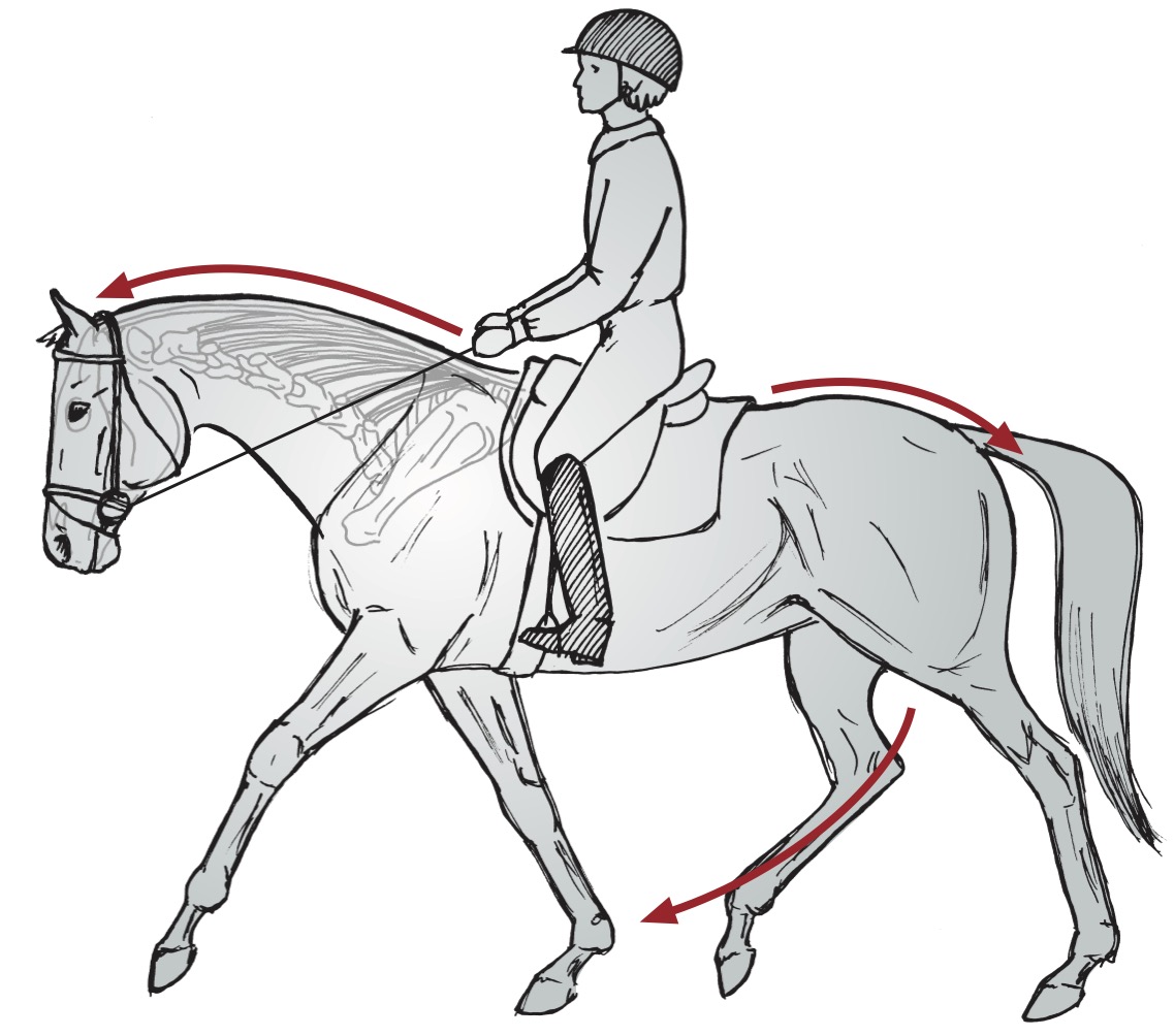 Swinging over the back will only become possible when the horse stretches toward the riderās handsāthereby stretching the neck muscles and āopeningā through the throatlatch (meaning the place where the head meets the neck). This is going to be a long process for a horse that has not been schooled in this direction from day one of his training. In a way, he must be retrained. Therefore, it will be a while before this horse feels a sense of well-being under saddle.