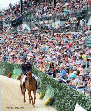 A record crowd turned out for Friday’s dressage to see stars such as Boyd Martin, here aboard Blackfoot Mystery. | Photo copyright 2016 by Nancy JafferIt was amazing to see the main grandstand packed–for eventing dressage! Today’s attendance of 14,171 appears to be a record, and it is expected based on advance ticket sales that by the time the event ends on Sunday, more than 90,000 people will have made a pilgrimage to Rolex.