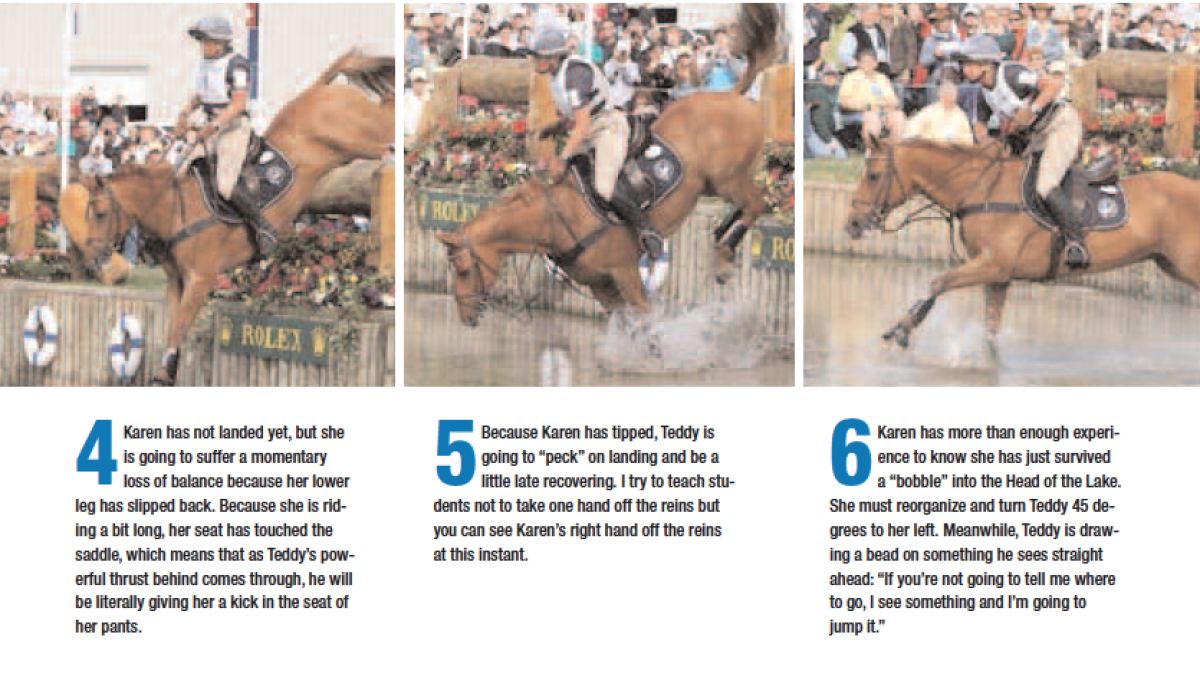 Derek di Grazia designs cross-country courses that require brave, accurate riding. My definition of “brave” is to gallop into a 6-foot-6 drop into water with a very big corner three long strides after the landing on a horse who has never been to a four-star event. Eventual Kentucky winners Oliver Townend and Cooley Master Class (Coolio) are shown here at Fence 18AB, the Land Rover Head of the Lake, the signature cross-country jump at the Kentucky Horse Park. Ollie knows the distance in the water is long and he has selected the brave option by approaching the question at an open gallop rather than a slower and more controlled canter. In the air, Ollie is already planning his line to the corner and Coolio looks like, “That all you got?” Nancy JafferOllie’s lower leg is in the right place and Coolio is going to land in balance. However, you are about to see why I disapprove of cross-country riders with longer stirrups. All of Ollie’s angles are correct and his touch on the reins is just right, but he has allowed his weight to settle onto the saddle. In a split second, Coolio’s hind end will deliver Ollie a monumental kick in the seat of the pants. Nancy JafferThis is why riders need shorter stirrups when landing over a big drop. Certainly four-star speed is a factor in riding shorter, but the essential reason for shorter stirrups is that big drops cause horses to lift their hind end to clear the obstacle on the way down. Look back at the previous image and imagine that Ollie had kept the same exact angles, but shorter stirrup leathers had raised the points of his knees an inch or so higher in the saddle. His seat bones would then be a commensurate amount above the saddle and Coolio would have room to use his back without disturbing Ollie’s balance. This is not Ollie’s first rodeo and he is catching his balance with his knuckles against Coolio’s neck while keeping his eyes on the next jump. Nancy JafferThere is not enough room between the obstacles for Ollie to get his reins back. Instead, he has opened his arms to lift his hands, bring his elbows back and maintain contact and control. (I want my one- and two-star riders to get their reins back before five strides while three- and four-star riders have four strides to get their reins back.) Coolio is already measuring the next obstacle by lifting his head and Ollie has a straight line between his elbow and the bit. The stability of his upper body here is based on his lower-leg position. Ollie is a clever rider—he knows Coolio sprawled a bit on landing, but the striding is long and he has used that to cover the distance. One stride later, he has Coolio on a balanced, open gallop with his horse’s hocks well under him and ready for the next fence. Nancy Jaffer“When in doubt, wait it out,” is the experienced cross-country rider’s maxim. Ollie makes sure Coolio actually jumps before he bends over. He is soft with his reins but slightly behind the motion. It is better to be a second behind the motion than a split-second in front of it. Most glance-offs at upper cross-country levels are caused by riders assuming that because they see their stride, their horse will jump. I call this mistake “riding off your eye, not your leg.” Nancy JafferCoolio is landing well beyond the maximum corner and Ollie is already planning his turn to another obstacle. Riders finish Derek di Grazia’s courses and remark on the relentless nature of his designs, which are both physically and mentally challenging. At the four-star level, you can’t afford to take a break. Ollie is still taking care of business. This pair will gallop on to come home inside the time, setting themselves up to win the 2018 Land Rover Kentucky Three-Day Event. Nancy Jaffer