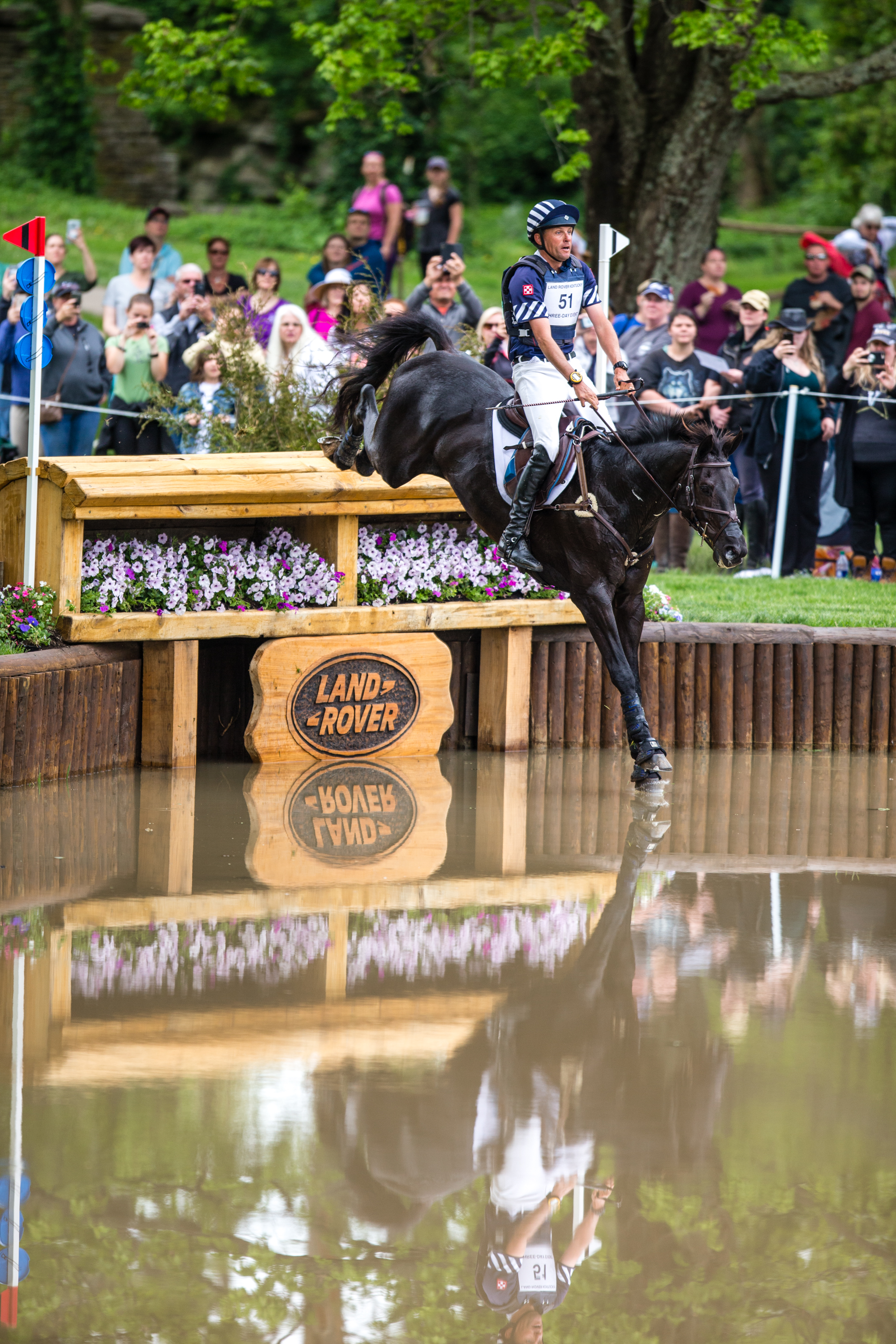 Carawich makes it a bounce and takes off. It’s not a cheap jump. He’s going up quite powerfully. Usually green horses jump in the air. Most experienced horses, when they see water, want to touch the ground wuickly. They slide their stifles over the fence so that their hind legs will be there when they land. But this horse is really jumping.