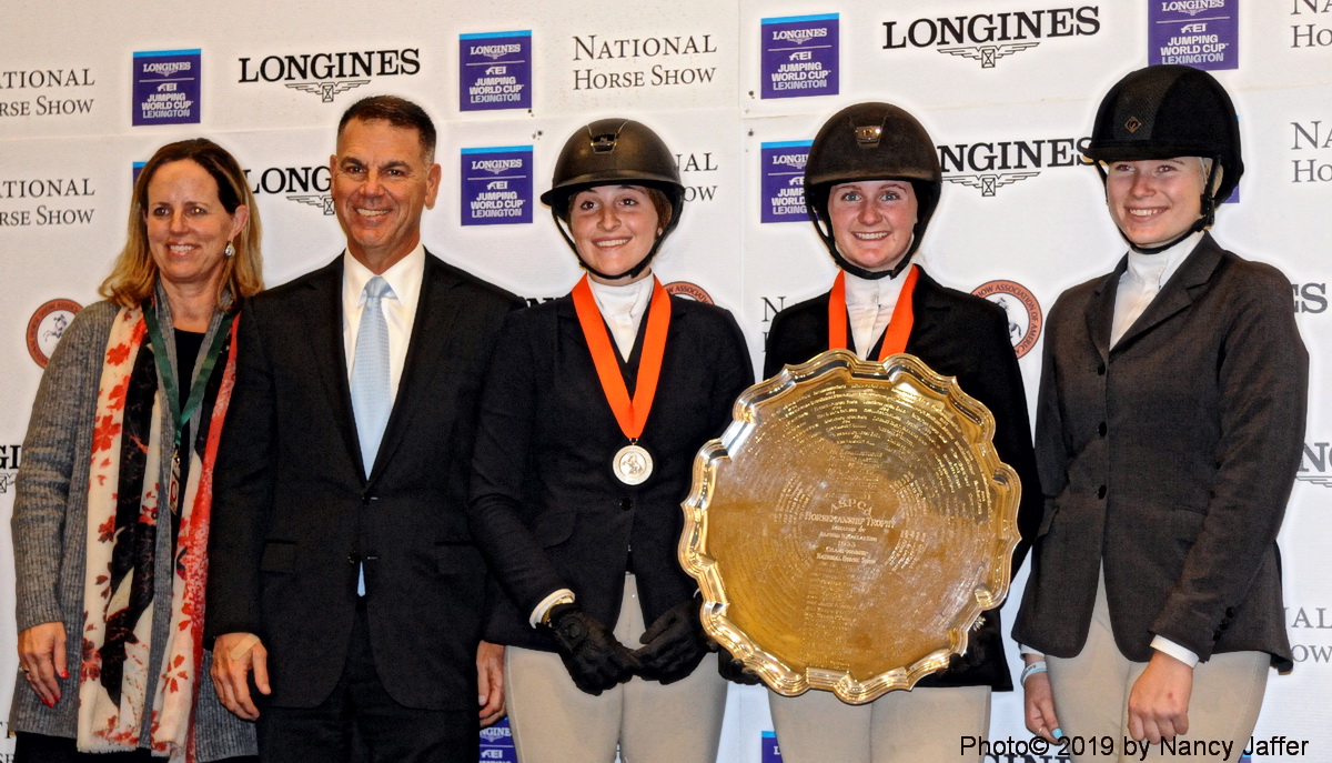 Following the flat phase, Ava was third, behind Emma Fletcher, the winner last month of the Dover Saddlery/USEF Hunter Seat Medal Finals, and Breanna Bunevacz, who led the way. In the second round, Breanna’s horse had a hiccup at the gate oxer, dropping her out of the ribbons. But the other placings weren’t so easy to decide, so six were called back for another test. Ava was at the top of the list again, despite her horse, Acer K, being wide-eyed in the second round when the lighting changed after someone opened a curtain behind the judges’ stand. She just kept going and “really rode,” said Jimmy. Even so, he and Tammy thought another test for the top six was necessary. It ended with a long hand-gallop to the final fence, where Jimmy appreciated the fact that the riders got up out of their saddles and went for it.