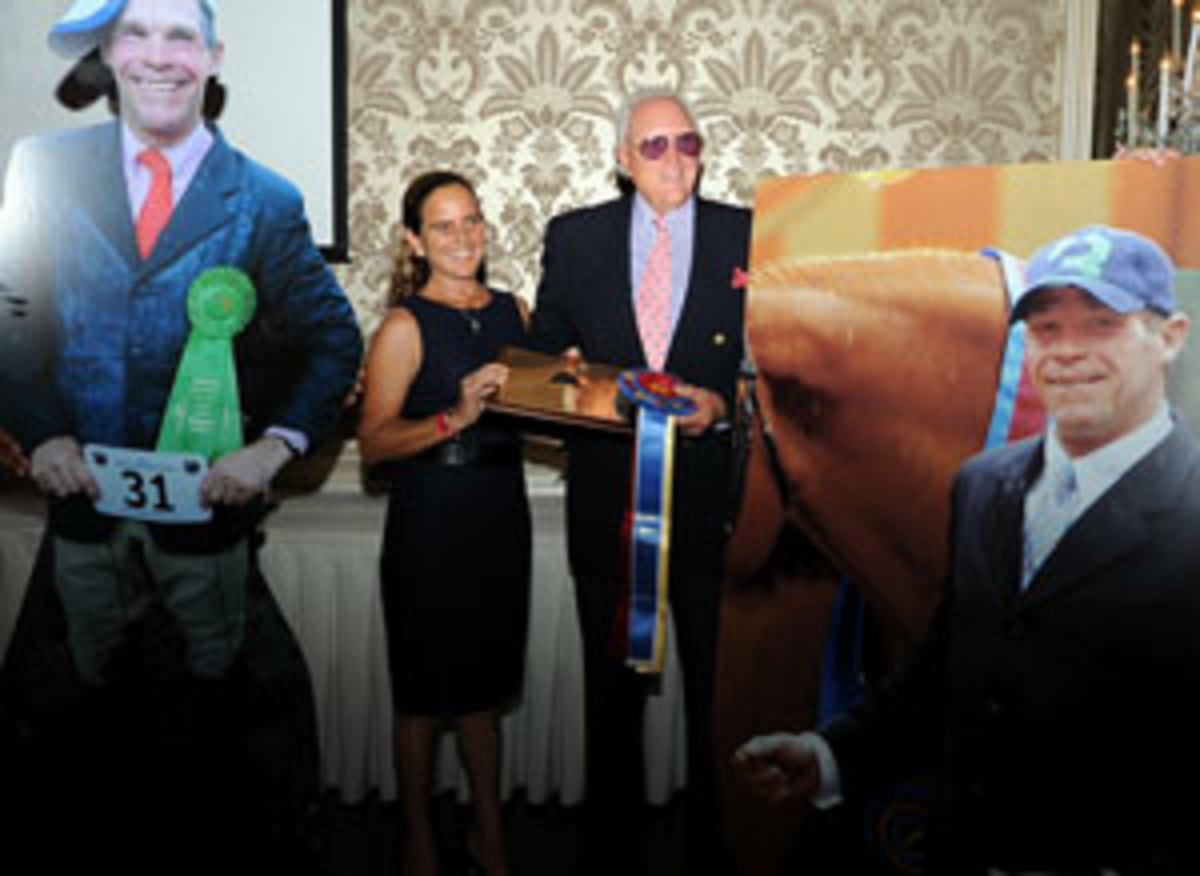 Those inducted this year included the black mare Aldie Belle and hunter pony extraordinaire Wizard of Oz, along with the irrepressible Susie Schoellkopf, judge Brian Lenehan, rider Jane Womble Gaston and amateur-owner hunter rider Bruce Duchossois. All but one of the people honored were on hand to accept. However, Bruce is undergoing chemotherapy and couldn’t make it. He was with us in more than spirit however — larger-than-life photos of Bruce were part of the ceremony, which was the next best thing to having him there in person.