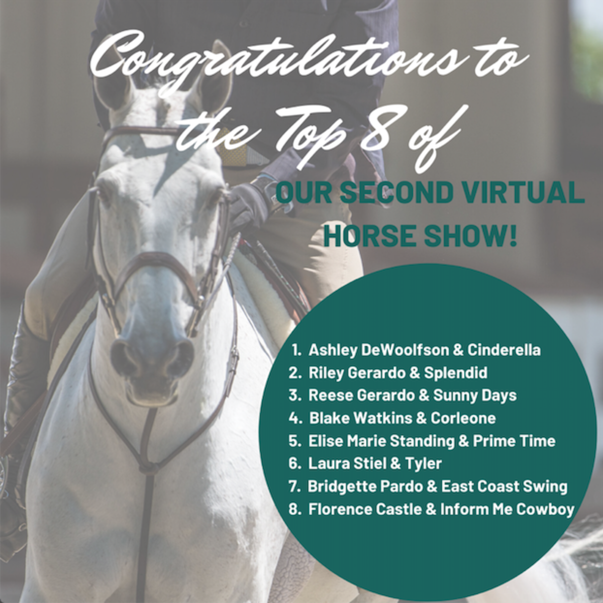Congratulations to our top-placed horse-and-rider pairs! Below are the results and some of their rounds.