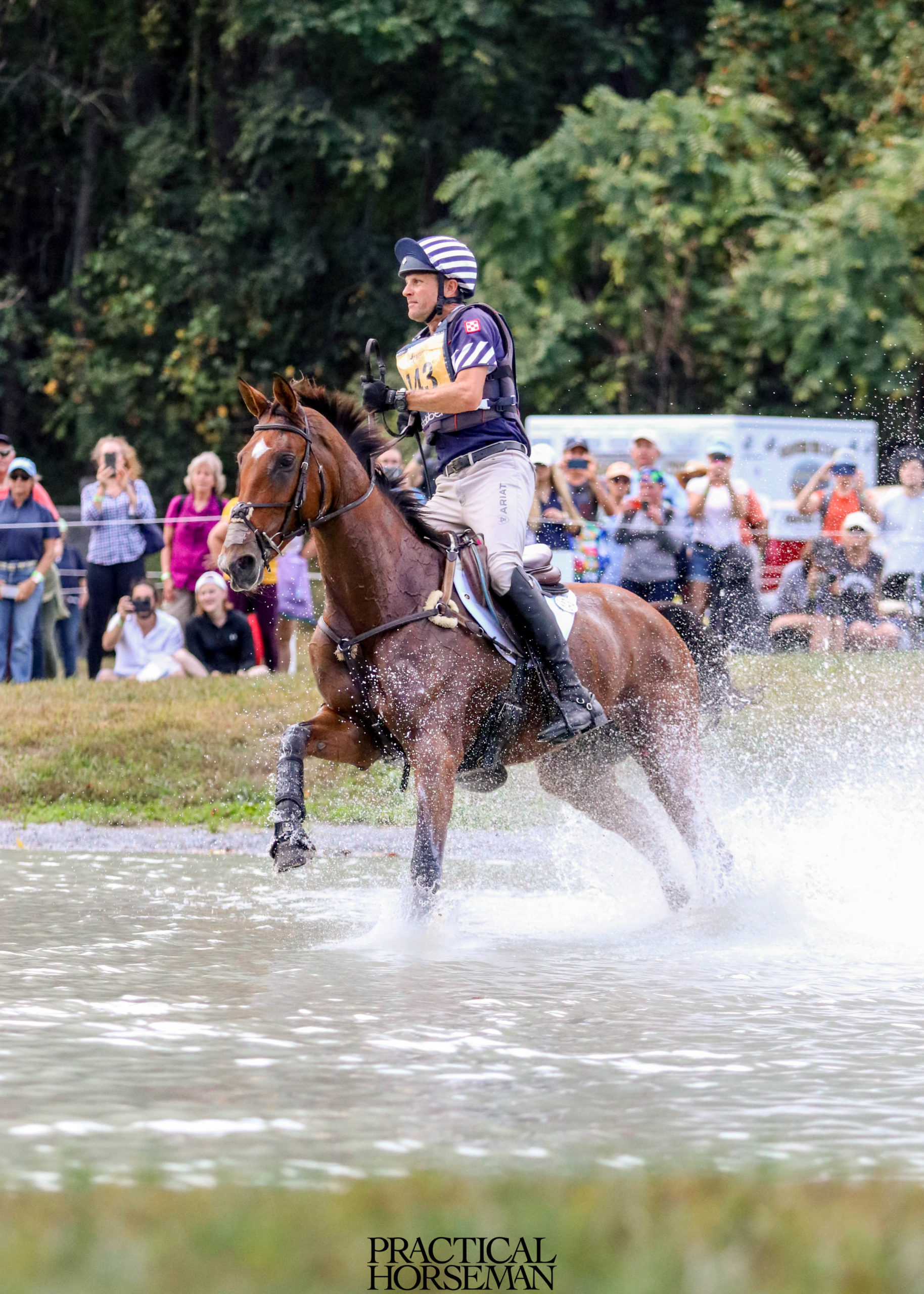 As for his ride, Meade explained that his horse, Superstition, a 12-year-old gelding from the British Hanoverian Horse Society, is a bit unorthodox and had an unusual warm-up before cross-country. “He gets a bit stressed with the occasion, so it’s about keeping it easy,” Meade said. “I jumped a couple of fences this morning, hacked up here, jumped two fences in the collecting ring and when out. To me it’s about keeping his heart rate resting before he starts. … Five-star eventing isn’t a sprint. It’s about letting them get into a rhythm and breath and relax and lob.”