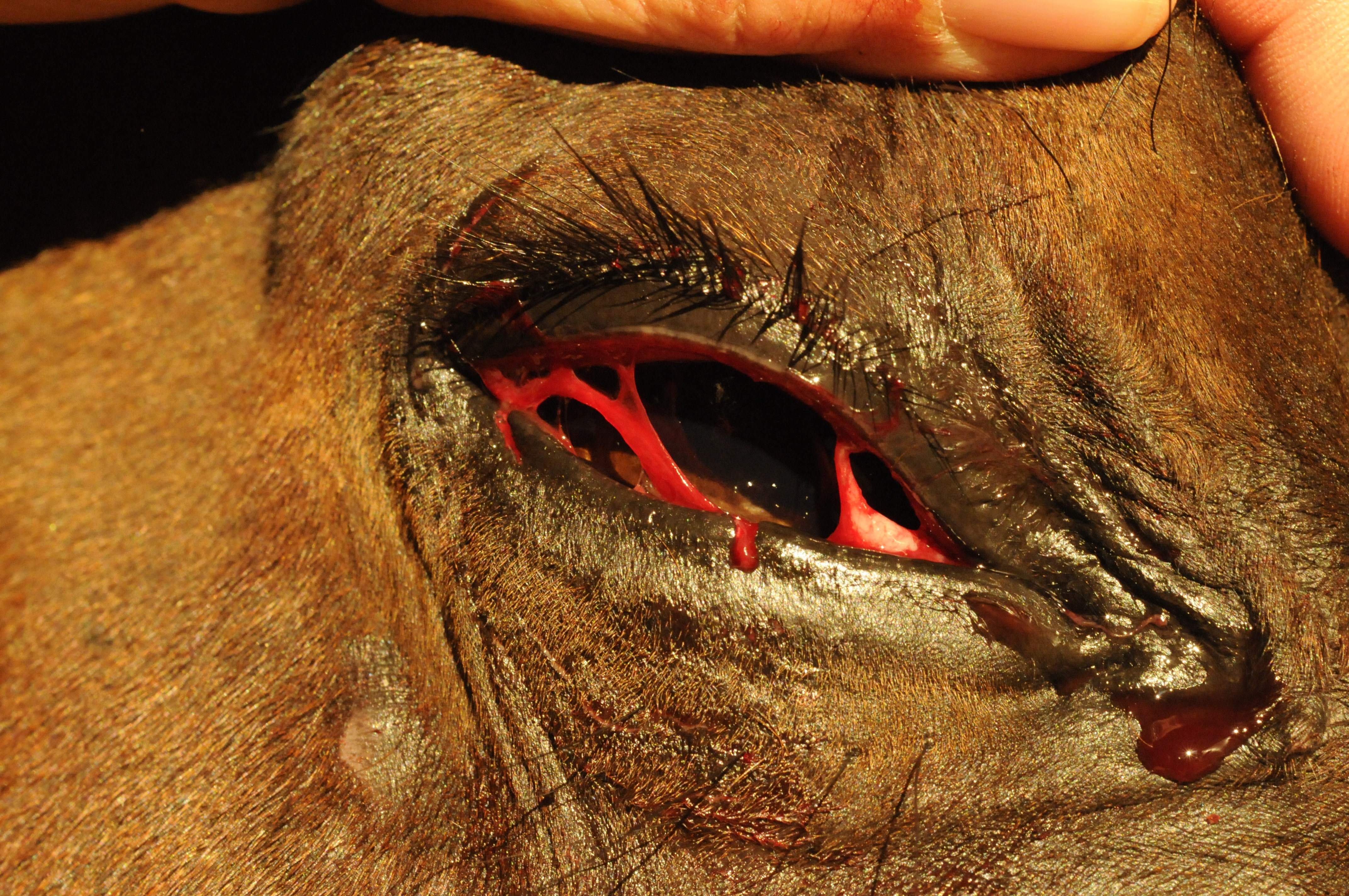 “An injury in or around an eye is always an emergency. It may seem minor, but it’s difficult to tell without expertise and special equipment,” Dr. Mudge says. Swelling, squinting, redness, cloudiness, excessive tearing or other discharge should prompt a call to the vet. “Even a small laceration on the lid must be sutured to make sure that the lid heals with smooth margins and closes properly.”
