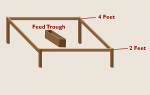 If you have only one foal, make the creep feeder sides about 8 feet long, set at your mare’s chest height. For each additional foal, add another 2 feet in length to each side. Space individual, shallow plastic, rubber or wood pans or troughs far apart and ?observe the group dynamics carefully to be sure that no foal is hogging the trough. Remember to ?remove excess feed daily to prevent spoilage.