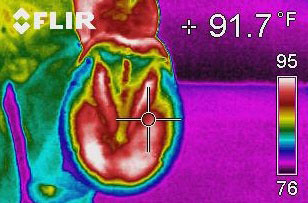 Advantages: Thermography is non-invasive and doesn’t require sedation. The camera is at least ten times more sensitive to heat than the human hand, so it picks up minute temperature differences that could be missed in a physical exam.
