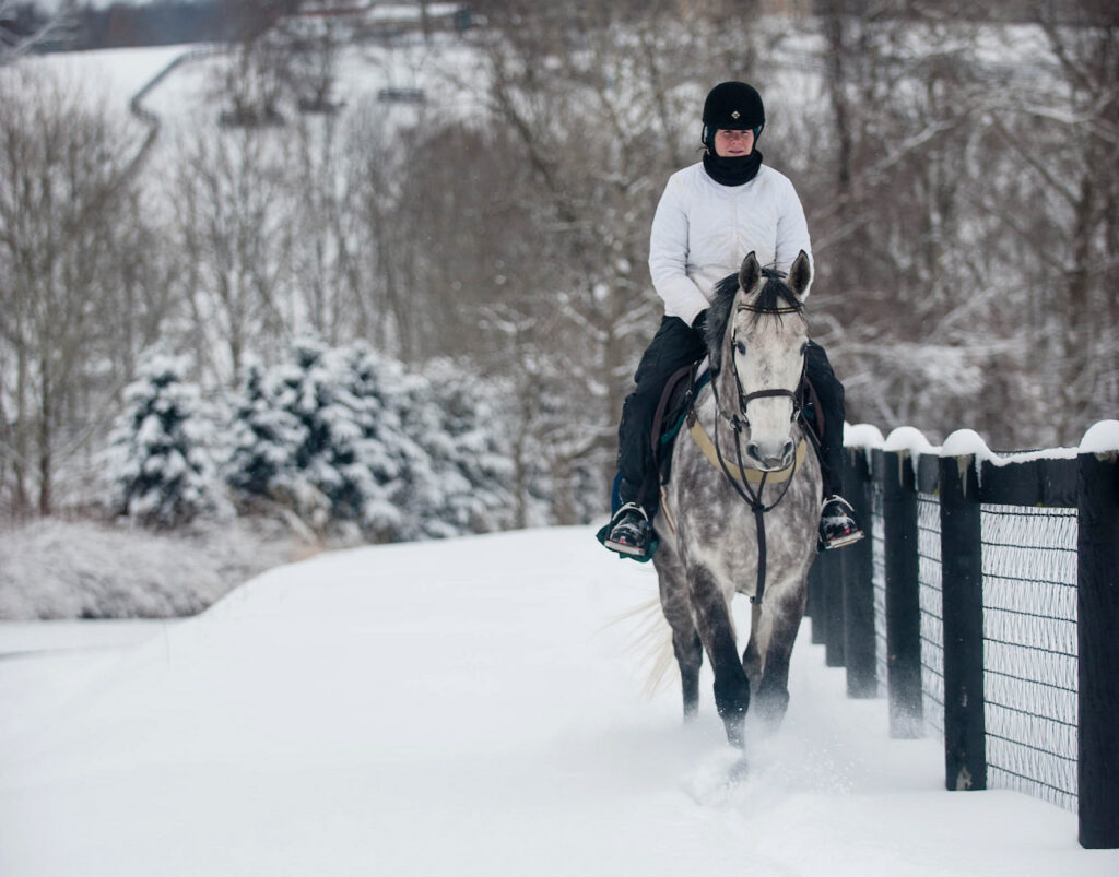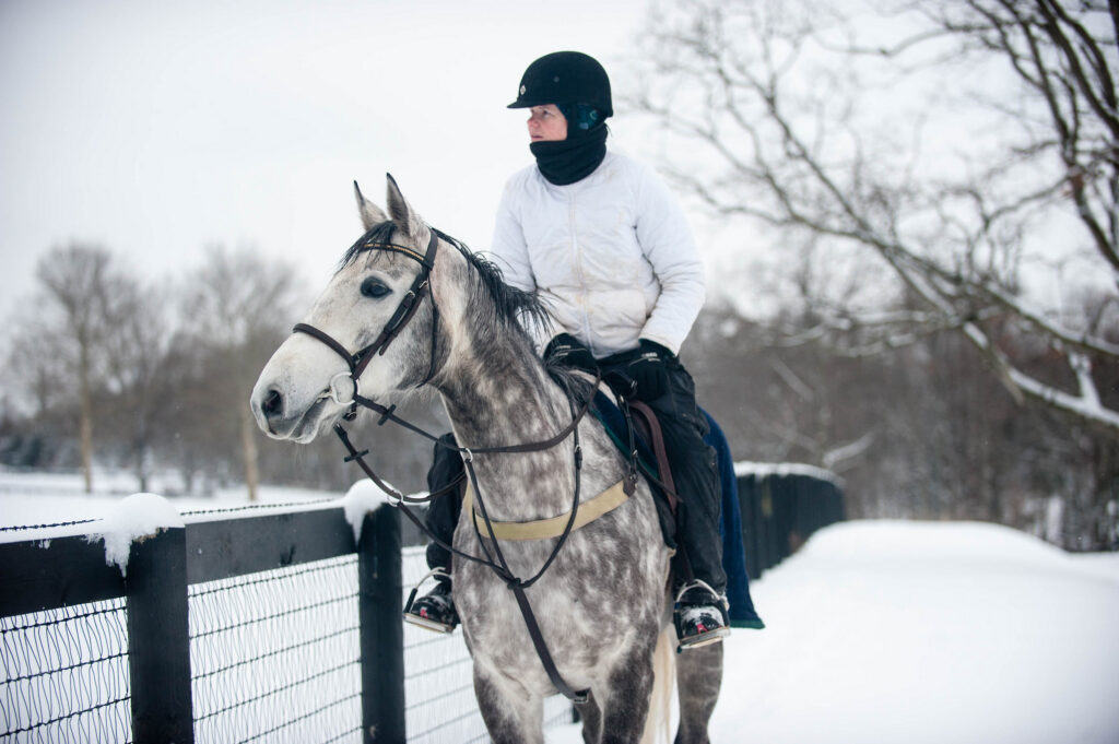 If your horse is older or has arthritis or any other existing joint issues, he’s going to feel even stiffer in the cold. In extremely cold temperatures, it may be best to only walk and/or trot with these horses. As a general rule, keep your cold-weather rides to under and hour or even shorter, especially if you’re dealing with harsh winds in addition to the cold.