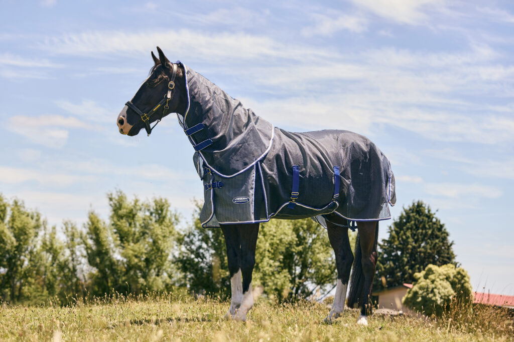 2. Keep your horse covered. One way to reduce bites is to keep a fly sheet on your horse during insect season. Made of fine mesh and equipped with closures to keep out bugs, clothing designed specifically for horses with sweet itch has extensions to cover the neck, belly and tail, the areas where Culicoides spp. are most likely to bite. A fine-mesh mask may also be needed to protect the horse’s face and ears.
