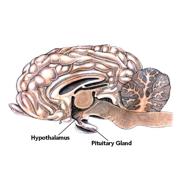 In a normal, healthy horse, explain Dr. Carmalt and Dr. Frank, nerves deliver the chemical dopamine from the hypothalamus—often referred to as the brain’s control center—to the pituitary gland. There, the dopamine acts like a brake on the pars intermedia, regulating hormone production, says Dr. Carmalt.