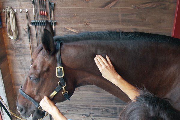 - Direct pressure—Palpating gently, you can feel a knot in the muscle tissue at the anchor point. Use the tips of your fingers to apply pressure directly to that knotted area. The horse’s brain interprets the pressure as discomfort and sends more blood to the area of the knot, which helps to soften the tissue. Do this for no more than 15 seconds.