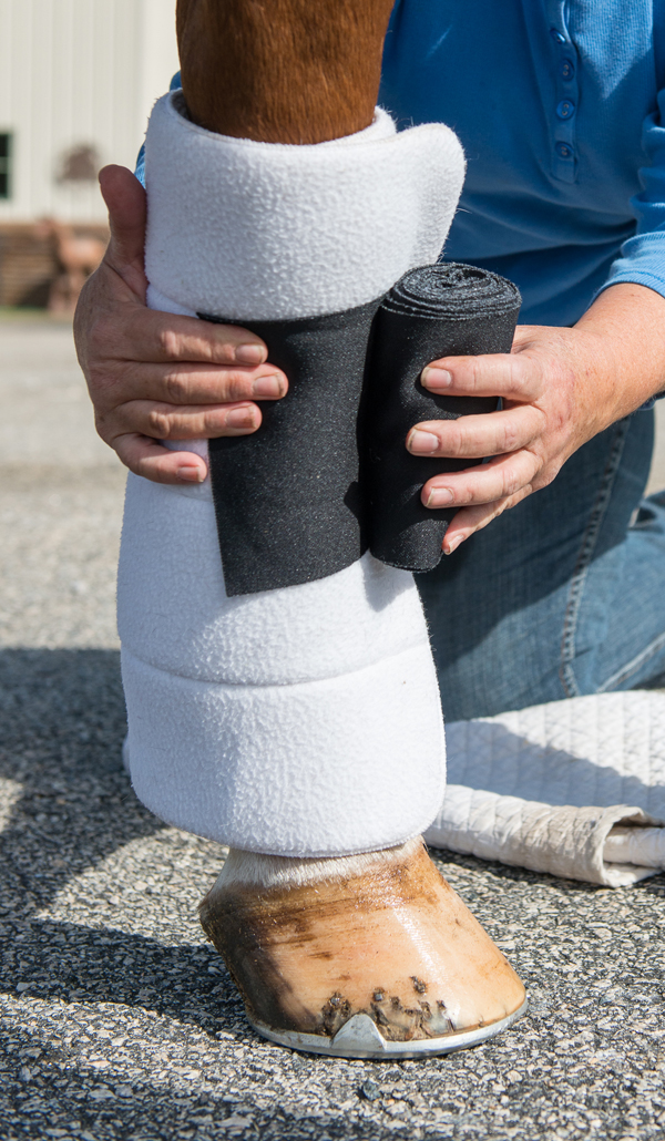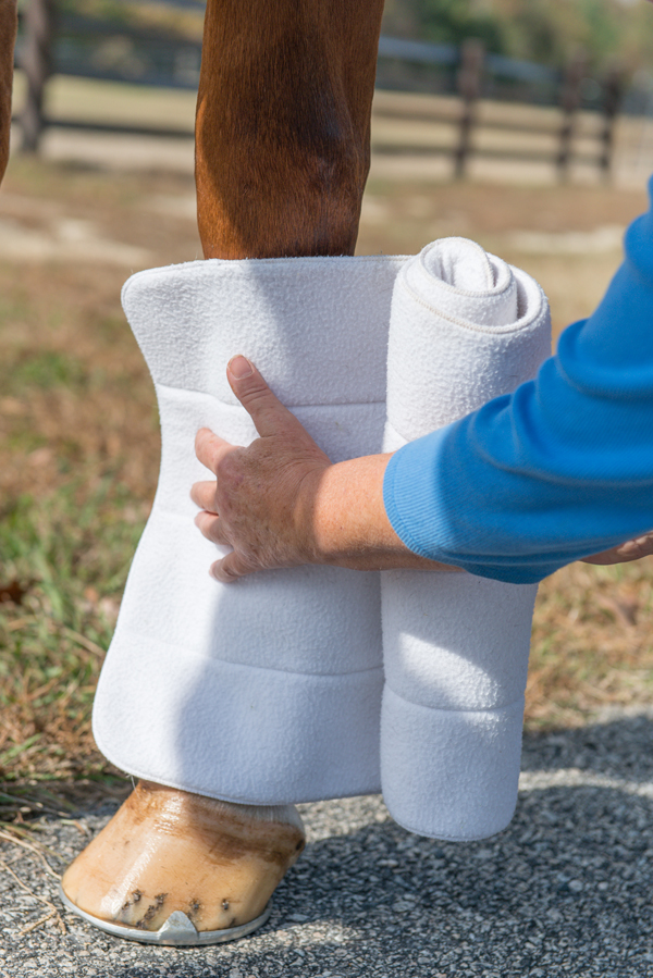 A standing wrap on a dry leg is the basic level. It gives your horse’s leg support, provides warmth and promotes circulation to prevent the leg from filling with fluid, commonly called stocking up. This type of application can be used if a horse tends to stock up while standing still, especially after working, or to prepare a conformation hunter who’s showing the following day.