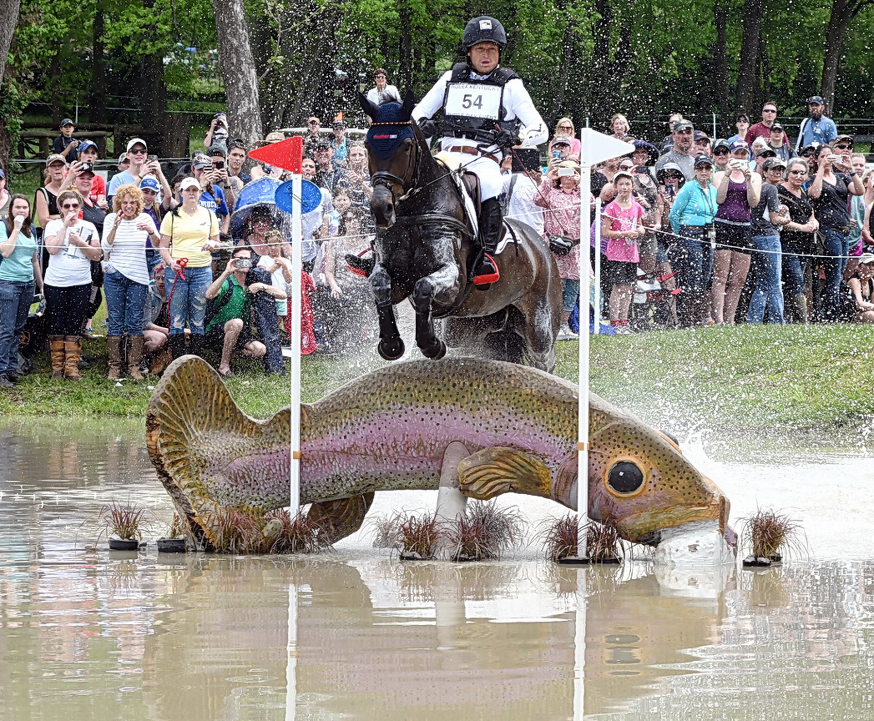 But the trip around the Derek di Grazia-designed course was no walk in the horse park for Michael Jung, either. At the Head of the Lake, which Derek had said was the last obstacle before things got really hard, Michael found himself sailing over the Boathouse, three strides after the Cedar Lodge, holding onto the buckle of his reins with only one hand. It was quite a dive into the drink—especially since the next obstacle, a giant wooden rainbow trout, was a mere four strides after the Boathouse.