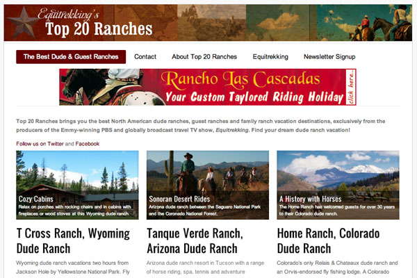 We at Equitrekking are excited to reveal our top 20 North American dude ranch vacations on a brand new website and ranch vacation resource?Top20Ranches.com.?The top dude ranches include geographically diverse picks from Arizona, New Mexico, Colorado, Mexico, Montana, Texas, Georgia, Wyoming and Idaho. After spending the last six years traveling the world searching for the best ranches, resorts and horseback riding travel destinations, it was tough to pick only twenty elite dude ranches and guest ranches. We’ve ridden and filmed at many of these ranches for our Emmy Award-winning TV show Equitrekking and written about the dude ranch industry for leading publications. Have you been on a great ranch vacation? Let us know where. Check out our picks for the?best dude ranches! Have a ranch you think should be on this website,?email us. Also, check out the Equitrekking Vacation Guide to find more great dude ranches, guest ranches, cattle drive vacations and worldwide riding holidays.