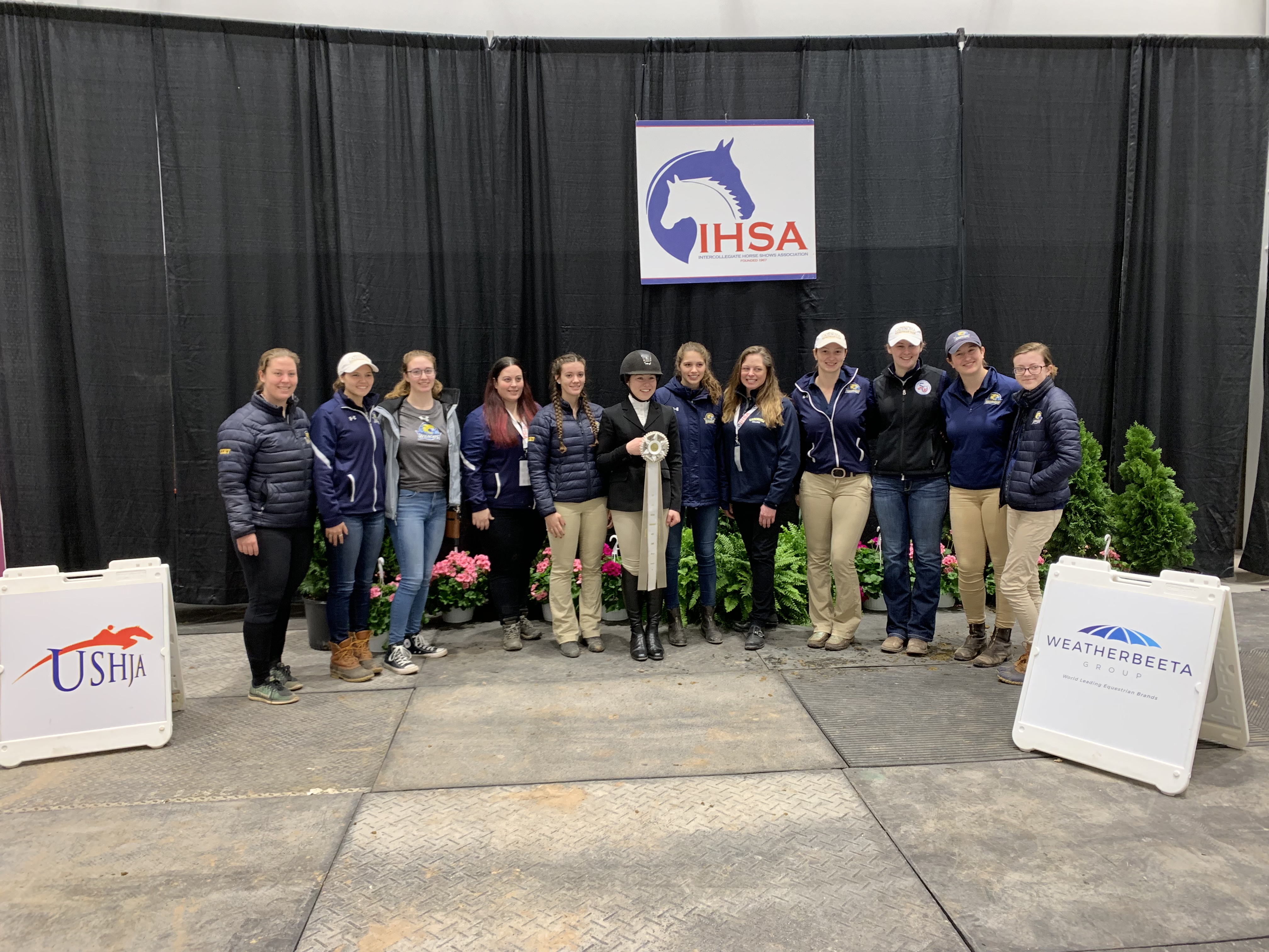 The horse draw was a “Monopoly” board game theme. There was a table set up and when we got over to the draw area, we were told to arrange ourselves in order of our birthday and then pick an envelope on the table. In that envelope was paper monopoly money, the amount of money in the envelope corresponded with a piece on the game board. When we got to the enlarged Monopoly game board that was taped to the wall, we had to find the piece that had our dollar amount and take it off. On the back of the game piece was the horse that we drew and what order we would go in the class. I drew Zoey from Centenary University and we were set to go 15. I watched a lot of trips to see how the course was riding before getting on. Zoey was wonderful to ride—we scored a 76 and ended up 4! There were a few places I could have ridden a little better, but I was still happy to be ending my IHSA career with that round! I was lucky that with Nationals so close to my college and my hometown; many professors, friends and family came and support me. After my class, I volunteered for the rest of the day helping out at the show and assisting with any tasks.