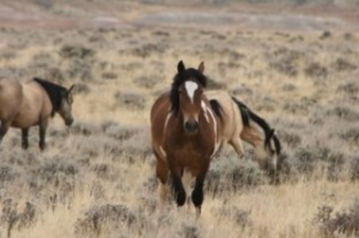 With binoculars in hand, Ken (Kenny) Martin and I are looking across the badlands in search of “The Wild Bunch,” one of a few bands of horses that Kenny has been watching for the past six years. War Bonnet is the dominant stallion of this band, which is composed of 10 mares. This is an unusually large number of mares for one stallion. We’ve been filming them for our Emmy winning PBS series Equitrekking and exploring Wyoming ranches for EquitrekkingTravel.com. As I stare across the vast land of yellowish grass and hills with lines of red, I realize that the wild mustangs in Wyoming are even more majestic and interesting than I had even imagined.