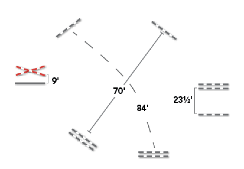 You can set this course up outdoors or indoors. Build the gymnastic on one long side of your arena from either two ground poles spaced 4-foot-6 apart or a placing pole or cavalletti (set at its lowest height) with 9 feet to a crossrail. On the other long side, create a one-stride in-and-out with a vertical and oxer 23½ feet apart. Then set up a six-stride (84-foot) bending line on one diagonal and a five-stride (70-foot) straight line on the other diagonal, each with a vertical and an oxer.