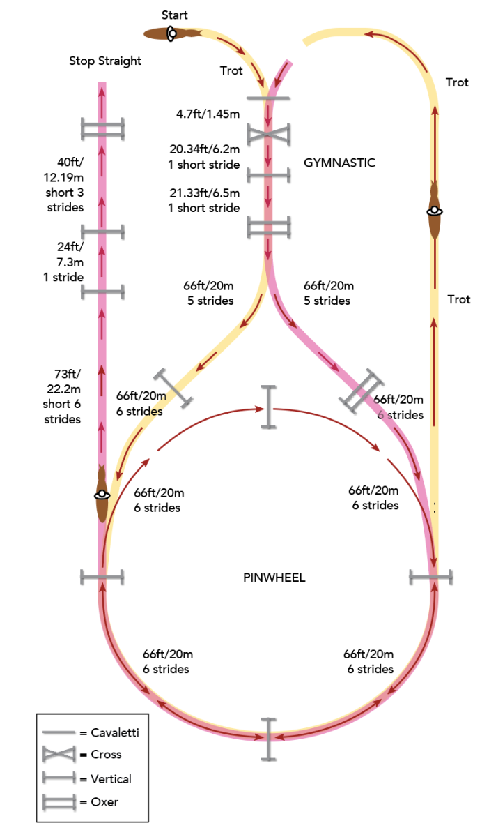 Another option involves going around the entire pinwheel again before heading to the vertical one-stride combination and the oxer.