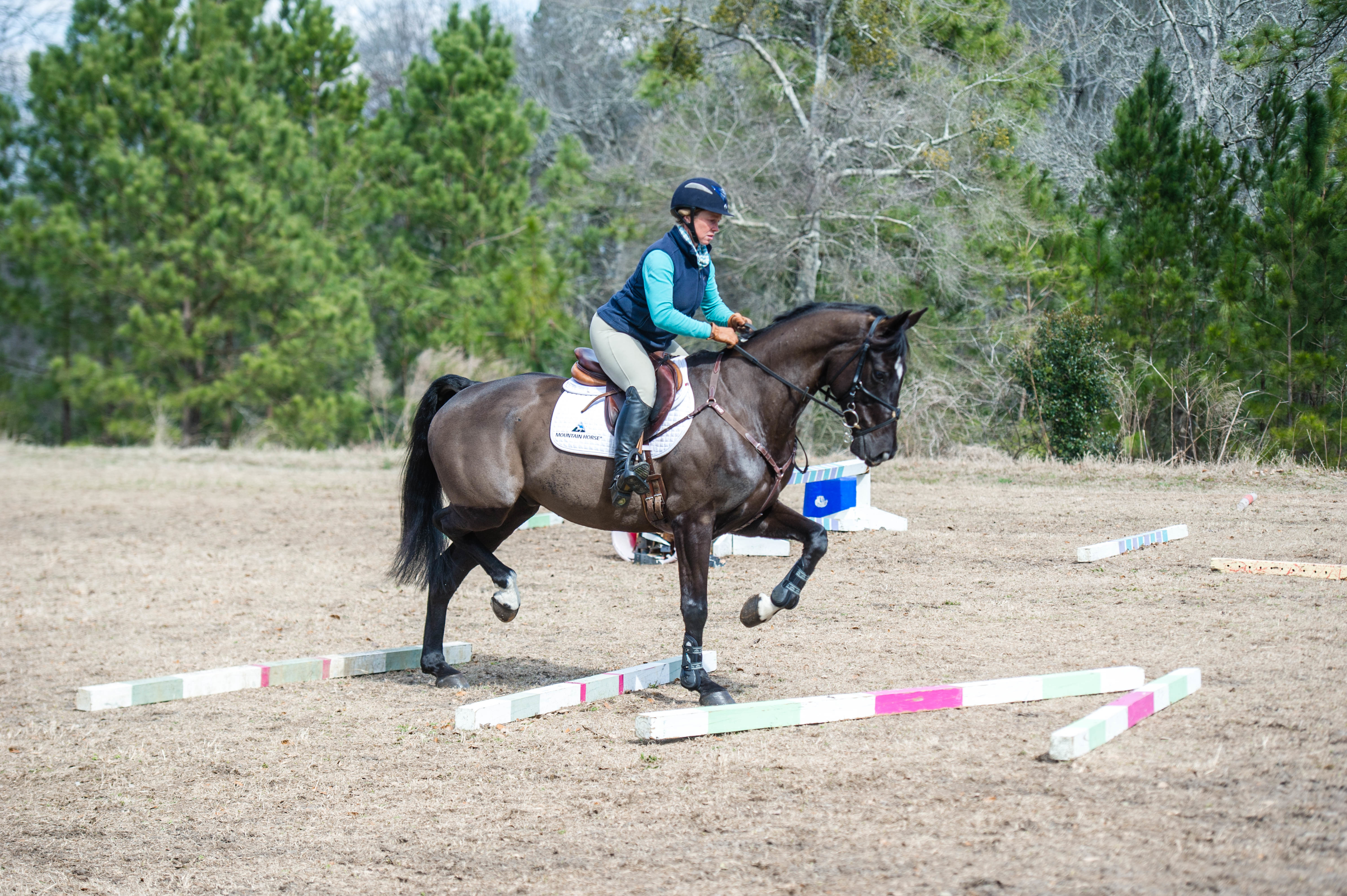 Once you’ve gotten acclimated to your new two-point position and can hold the balance position down the long side of the arena at the trot, you’re ready for an exercise. I like to put down ground poles at random intervals. Some are set on long strides while others are set on short strides, and I’ll even include angles. As Roulette trots over the poles, I focus on adjusting my position and maintaining my center mass over my base. This exercise helps you learn to control your horse while maintaining this new position.