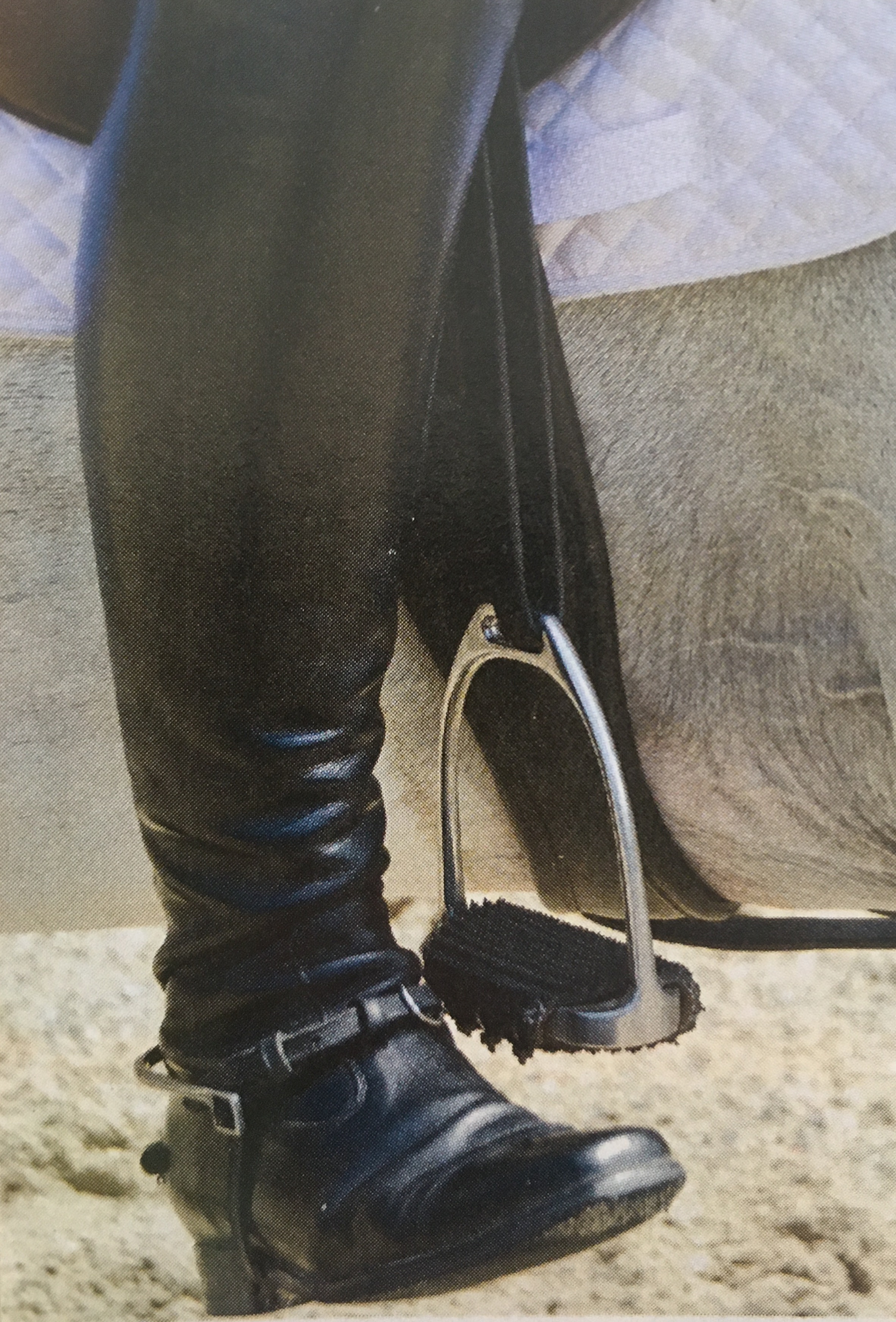 Fix 9: Next, try this counting exercise, which is terrific for improving your balance, getting your legs positioned correctly underneath you and strengthening your hamstrings and back. Start at the halt in your two-point position, with your seat out of the saddle and your weight balanced over your lower legs and heels. Grab some mane to help you balance, then slowly and rhythmically count to four as you gradually stand up in the saddle, pressing the balls of your feet against the bars of the stirrups as you straighten your ankle, knee and hip angles. Then slowly count to four again as you lower the weight back down into your heels and bring your body back into twopoint position.