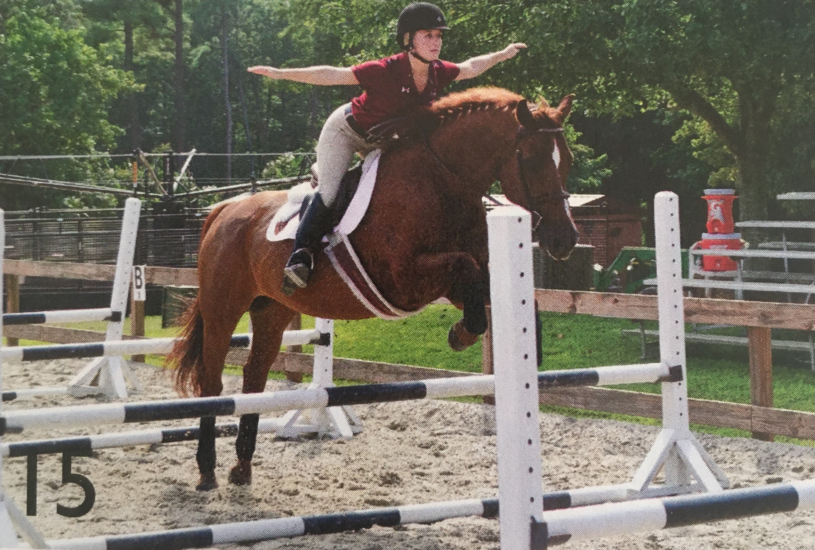 Fix 15: Ride a line of trot bounces. Practicing bounces will help you center your body over your horse and develop the balance necessary to avoid getting ahead of or falling behind his motion. Doing it without reins is also a great way to learn to rely less on your hands. You’ll need a ground person to help you adjust the distances and build the jumps as you progress through this exercise. If you don’t trust your horse to jump through the line without reins, replace the verticals described below with cavalletti turned to their highest height, set at bounce distances, and ask your ground person to longe you over them. Or set up a chute with extra standards and rails lining each side of the bounce line, creating barriers high enough to prevent run-outs.