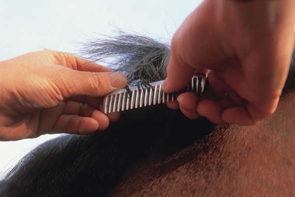 Start by gathering your supplies: a pulling comb (usually a small metal comb about 3–4 inches long), a standard mane-and-tail brush and, if you’d like, a pair of latex gloves to make gripping the hair easier.