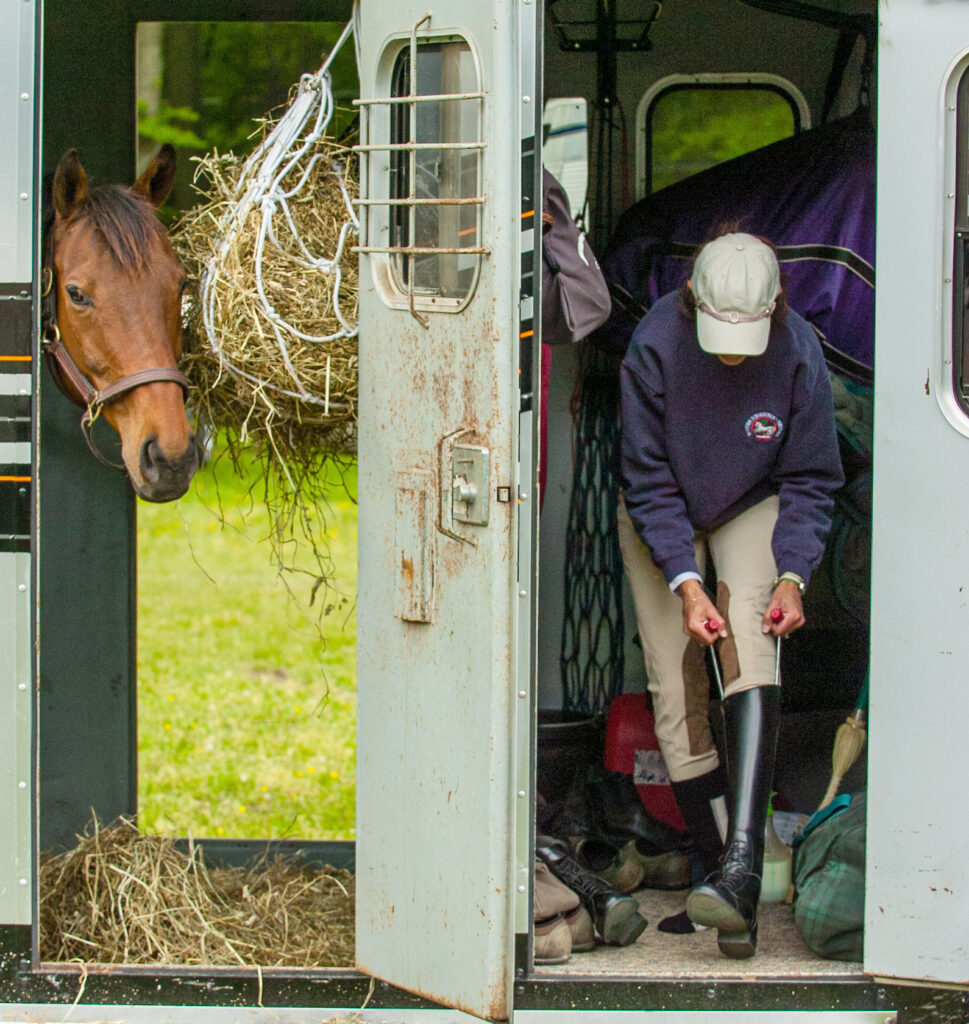 Most horses come off the trailer at new places bright-eyed and more energized than usual. So schedule enough time to settle him in when you arrive. Show him the sights by riding around the showgrounds and warm-up area or longe him briefly. Then take him back to the trailer and his haynet and give him a few minutes to mentally unwind before preparing for your class.
