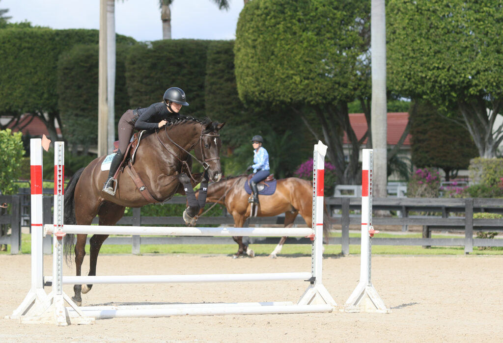Repeat this several times, focusing on keeping your horse straight through his body and holding the lead. Concentrate on the landing, as well, being sure he stays straight, organized and in front of your leg. Remember, the landing of every jump affects the approach to the next jump. If he changes leads in the air and lands on his stronger lead, continue straight for several strides before making a simple change through the walk or trot. We don’t recommend practicing flying changes during your warm-up because it makes horses anticipate the changes too much.