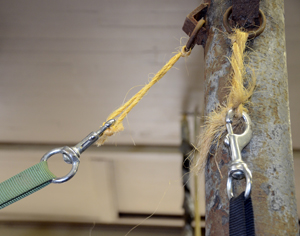 - Short lengths of breakable twine tied between the cross-ties and the walls. (Commercially sold “breakaway ties” don’t always release when horses pull hard on them.)