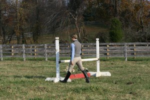 Step 3: After the jumps are set up, double-check your distance. Walk from the left standard of the first jump to the left standard of the second jump. Repeat on the right side to help ensure that your jumps are not set crookedly.