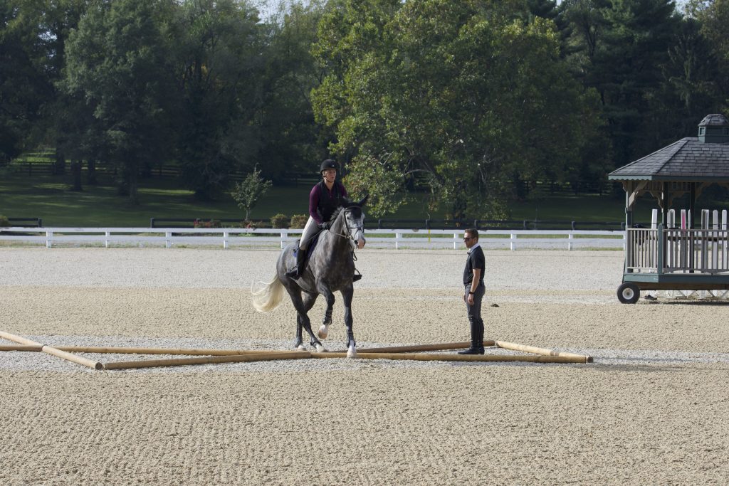 Riemer gave demonstrations of this exercise at the 2021 EQUITANA USA forum in Lexington, Kentucky. Here the rider is introducing her horse to the exercise by cantering over the tips of two triangles made of ground poles, focusing on her horse’s rhythm and straightness.