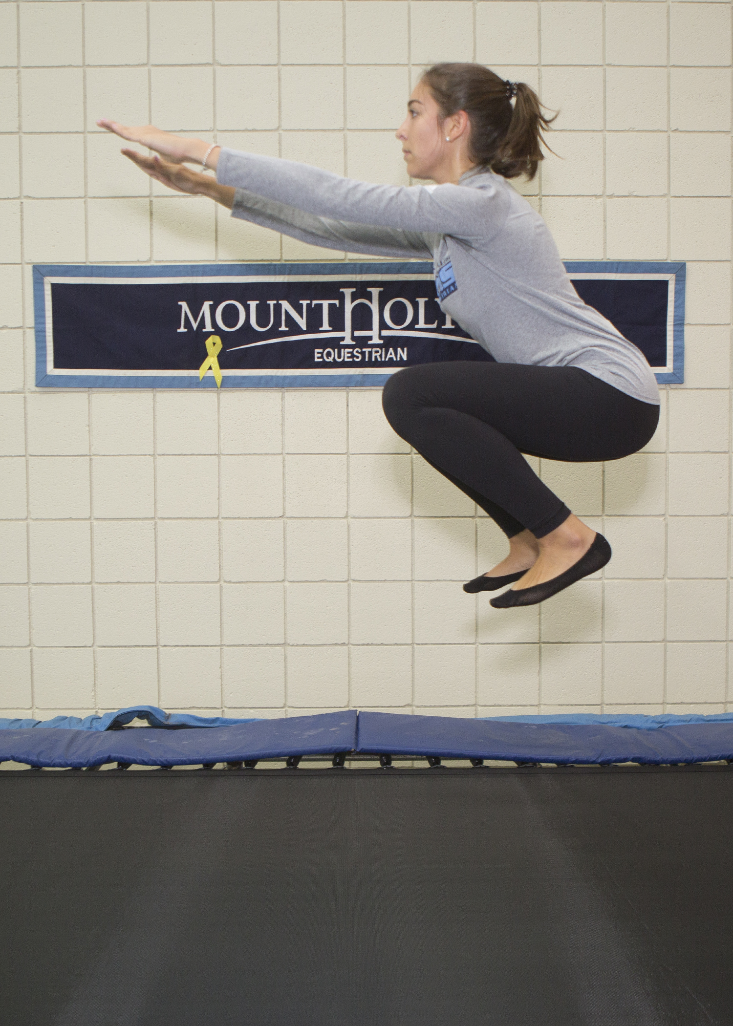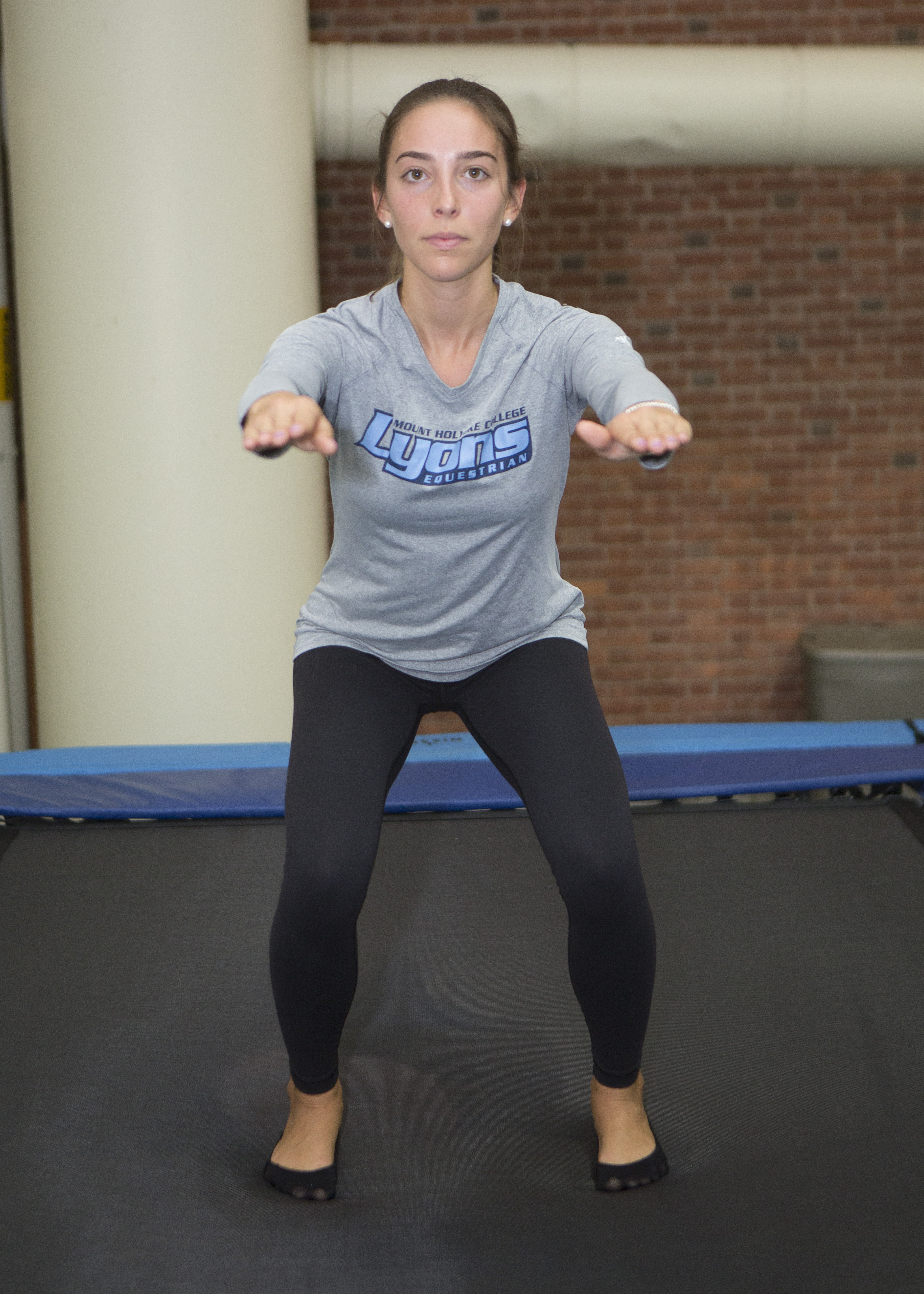 1. Standing in the center of the trampoline with her shoulders balanced over her hips and arms straight out in front, Mount Holyoke junior Katerina Alvarez gently bends and straightens her knees to start bouncing. Keeping her head balanced over her shoulders and staying relaxed in her ankle, knee and hip joints, she jumps as high as she possibly can.