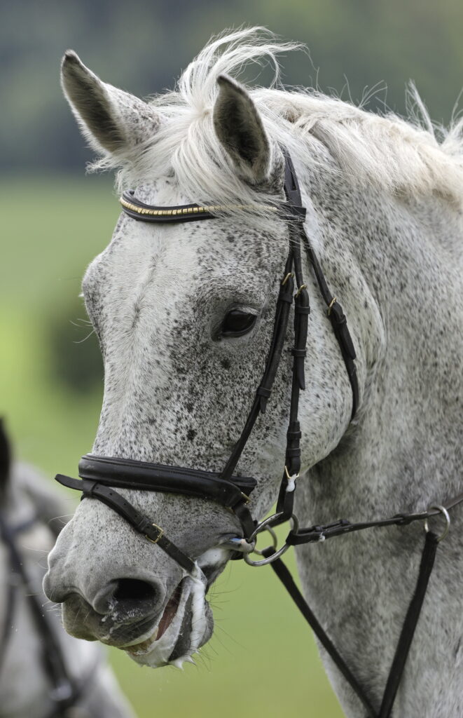 Speaking of discomfort, for instance, let me return to the topic of nosebands. You would be surprised how often I find that riders have adjusted the cavesson part of their noseband-and-flash attachment incorrectly. The cavesson should be two fingers below your horse’s cheekbone. When it is too low, it will trap your horse’s mouth between the bit and the cavesson. The last time I encountered this error, the rider explained that she had her noseband cranked so tightly because her horse had started “flipping his head” and “avoiding the contact”—that is, she had tightened it to prevent her horse from avoiding the contact. The rider did not realize that with her cavesson adjusted so low, she was pinching her horse’s mouth between the bit and the cavesson every time she used the bit. Sigh. Once we adjusted her equipment correctly, her horse relaxed and his symptoms of pain-avoidance disappeared.